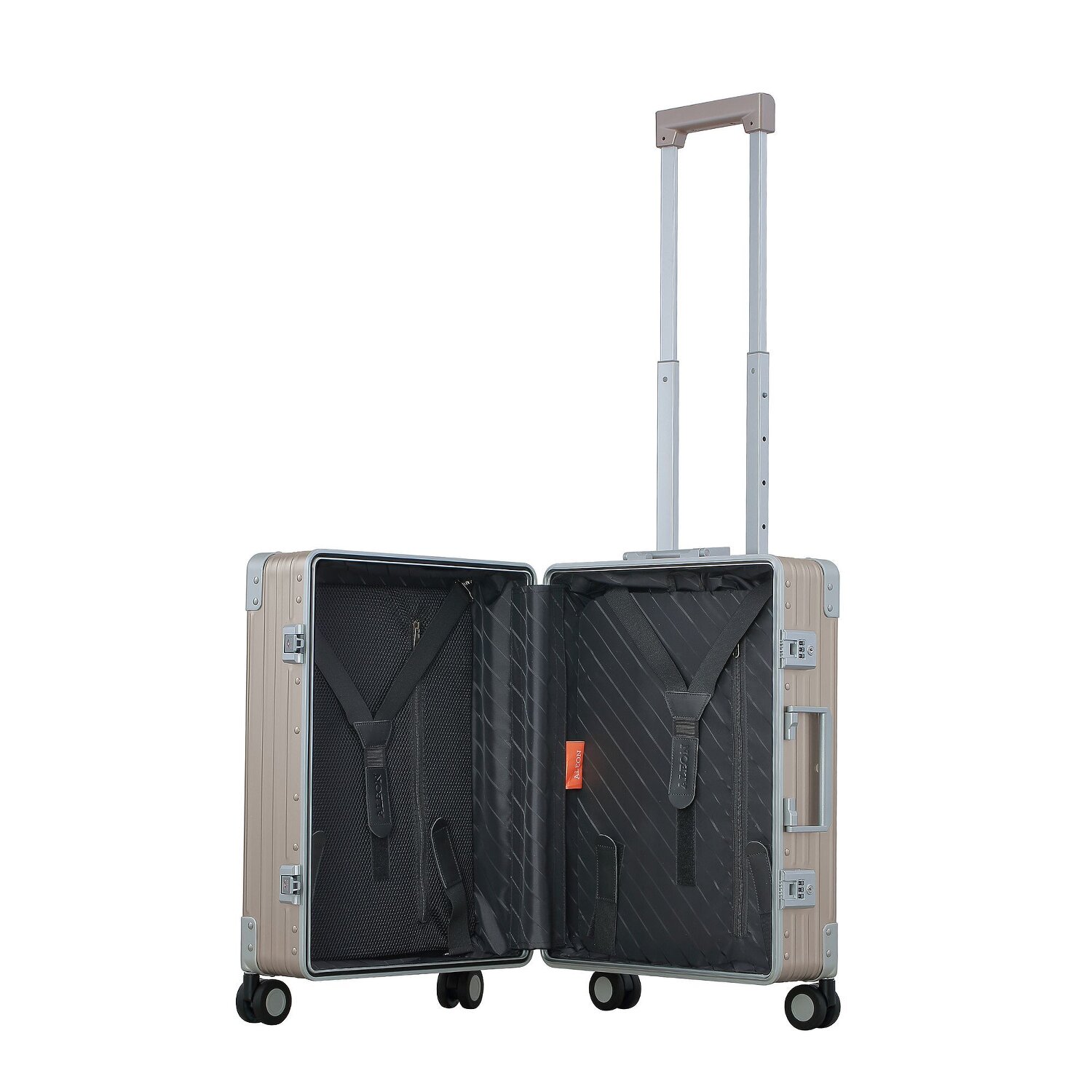 Go on a discovery tour with the "Fortis" cabin trolley from Aleon! Its robust allure stems from its aluminum construction, which gives it a simple elegance and immense strength. Equipped with a lockable handle and cross-body strap, it is the ideal companion for quick trips and fast air travel. A special TSA lock gives you the security you need on your adventures. The carrying handle, which is always at your service, makes it child's play to maneuver during hectic everyday travel. So, what are you waiting for? Start your luxury trip around the world with the "Fortis" cabin trolley!