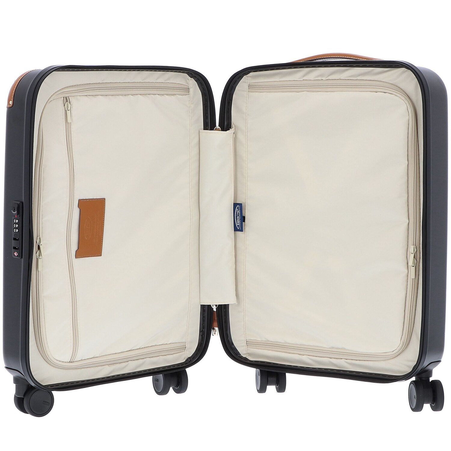 The chic 4-wheel cabin trolley from the Amalfi series is made of lightweight, particularly durable polycarbonate and trimmed with leather. Four quiet and in all directions movable double wheels ensure a comfortable ride. The trolley features two spacious main compartments, one with a zippered pocket, the other with an integrated cross-body packing strap, as well as a protected zipper, TSA lock and lockable telescopic handle. Combined with the usual elegant and stylish design of Bric's, this trolley is a real eye-catcher and the perfect companion on any trip.