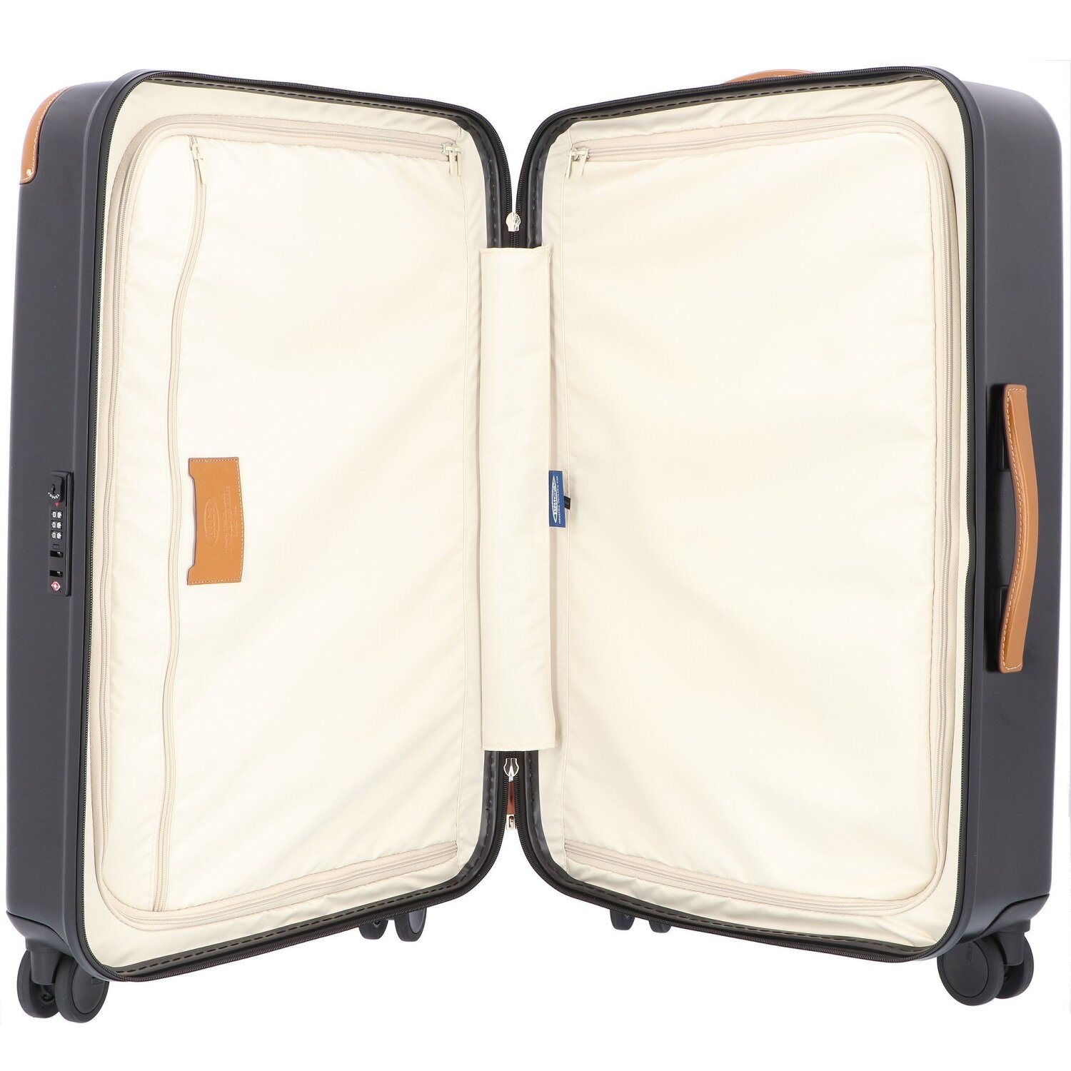 The chic 4-wheel trolley from the Amalfi series is made of lightweight, particularly durable polycarbonate and trimmed with leather. Four silent and in all directions movable double wheels ensure a comfortable ride. The trolley features two spacious main compartments, one with a zippered pocket, the other with an integrated cross-body packing strap, as well as a protected zipper, TSA lock and lockable telescopic handle. Combined with the usual elegant and stylish design of Bric's, this trolley is a real eye-catcher and the perfect companion on any trip.