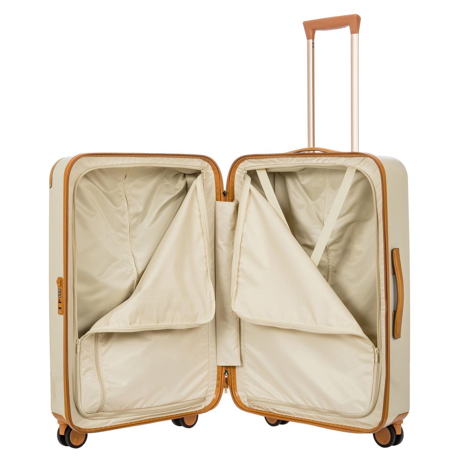 The chic 4-wheel trolley from the Amalfi series is made of lightweight, particularly durable polycarbonate and trimmed with leather. Four silent and in all directions movable double wheels ensure a comfortable ride. The trolley features two spacious main compartments, one with a zippered pocket, the other with an integrated cross-body packing strap, as well as a protected zipper, TSA lock and lockable telescopic handle. Combined with the usual elegant and stylish design of Bric's, this trolley is a real eye-catcher and the perfect companion on any trip.