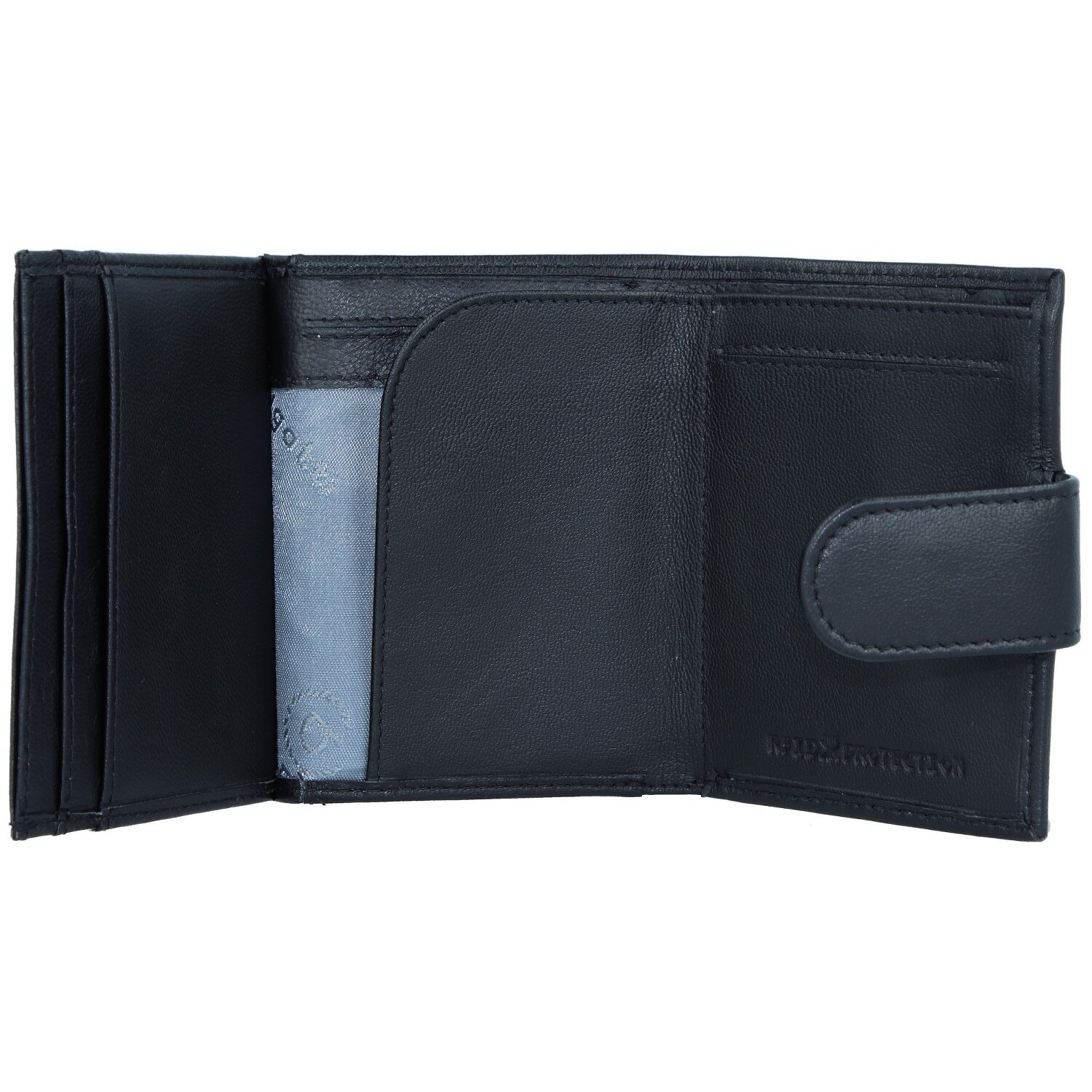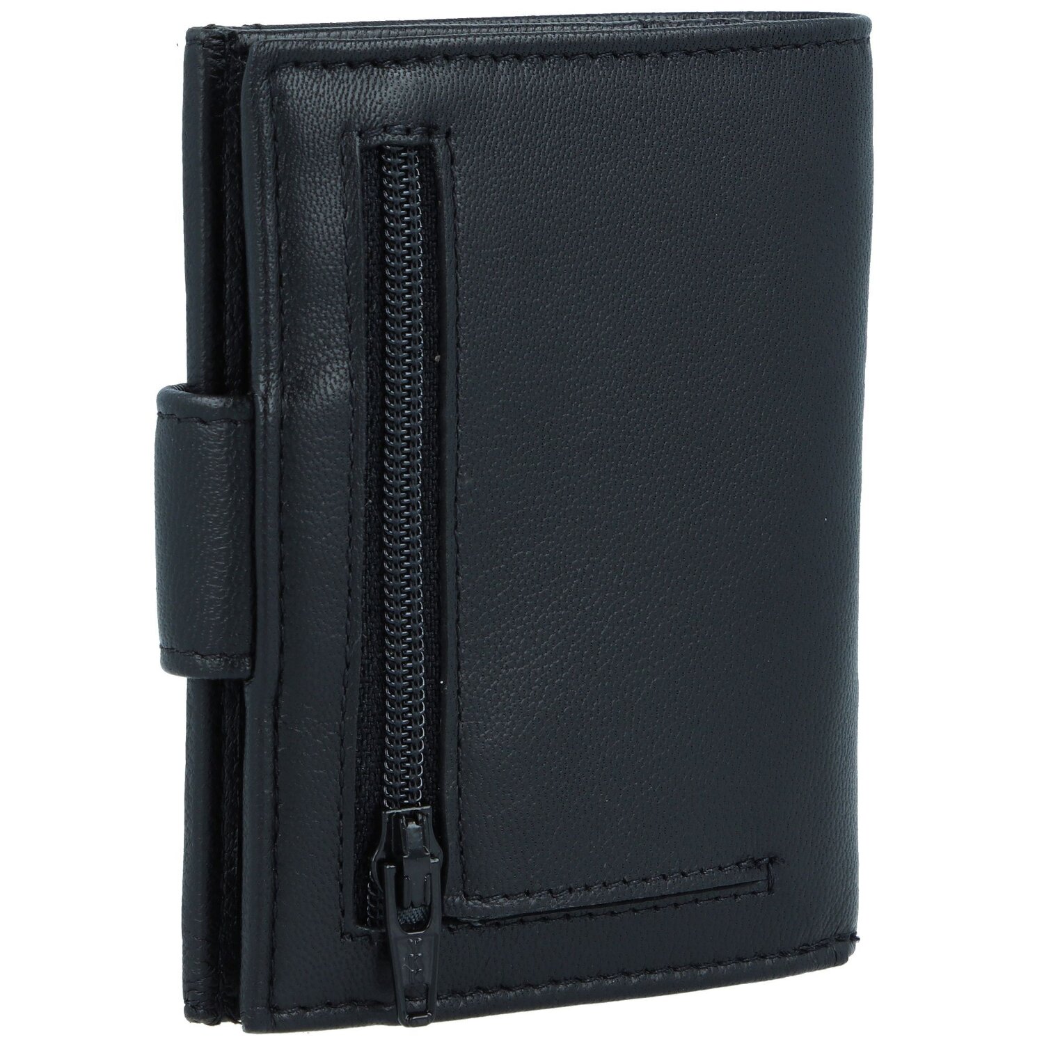 Compact, noble wallet made of high quality leather offers despite its handy size enough space for cards, cash and coins. In addition, the wallet has RFID protection against data theft. The case is closed securely by push button.