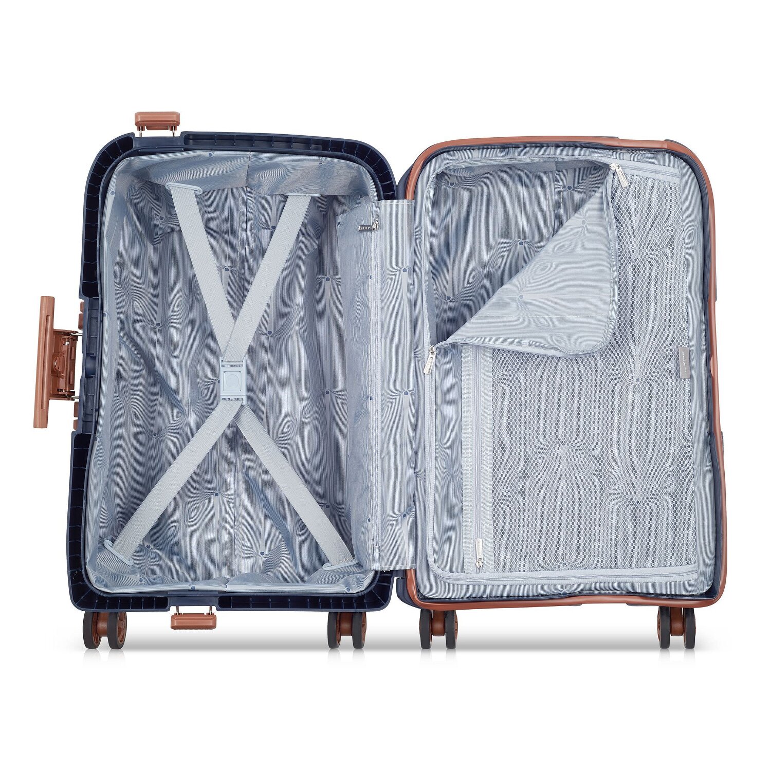 The hard shell trolley of the brand Delsey impresses not only with its beautiful design, but is also made of extremely robust polypropylene. Inside, in addition to the spacious main compartment with tension straps and a large shirt compartment, there are three more zippered compartments, including a wet compartment, for order and optimal overview.