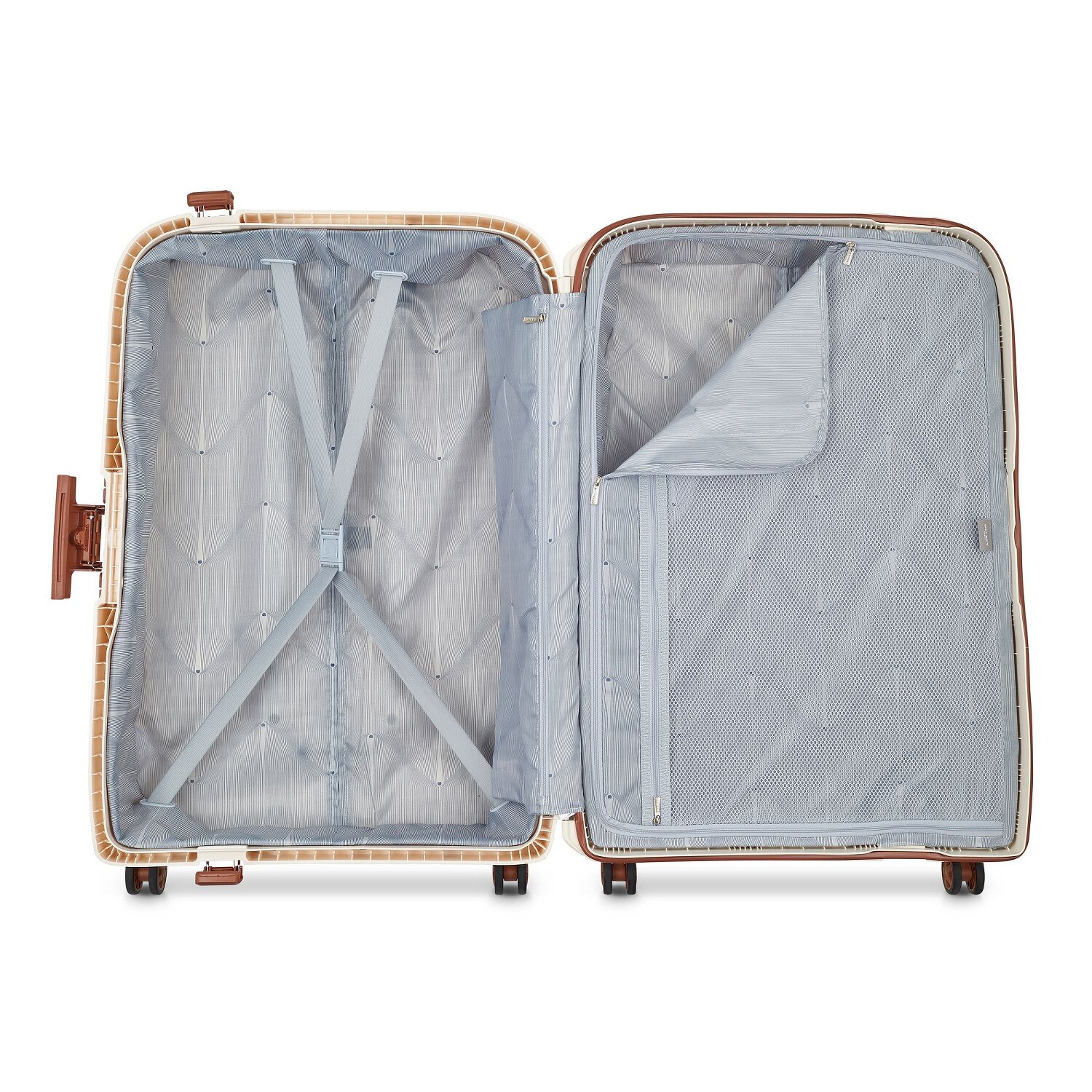 The Delsey brand hard shell trolley made of extremely sturdy polypropylene with TSA and combination lock for optimum security and four sturdy double wheels. In addition, a rubber seal ensures that the trolley is protected from moisture. With a shirt compartment, zipper compartment, packing straps and a wet compartment, you are perfectly equipped to store your luggage clearly.