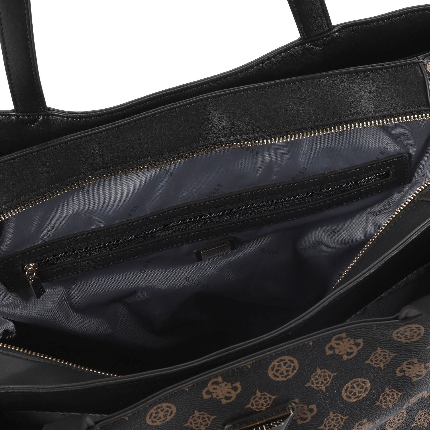 Welcome to the world of urban chic - with the "Wilder" shopper bag from Guess. An unmistakable accessory that combines style and comfort in its distinctive appearance. The bag is made of robust polyurethane, perfect for everyday use. The well thought-out division of the interior into three spacious main compartments, complemented by practical outer and inner pockets, is remarkable. Quick access to the inside pocket is ensured by an easy-to-use zipper. The medium-length shoulder strap makes it easy to carry - with the option of attaching the bag securely to a trolley. Discover the variety of the Guess "Wilder" collection today!