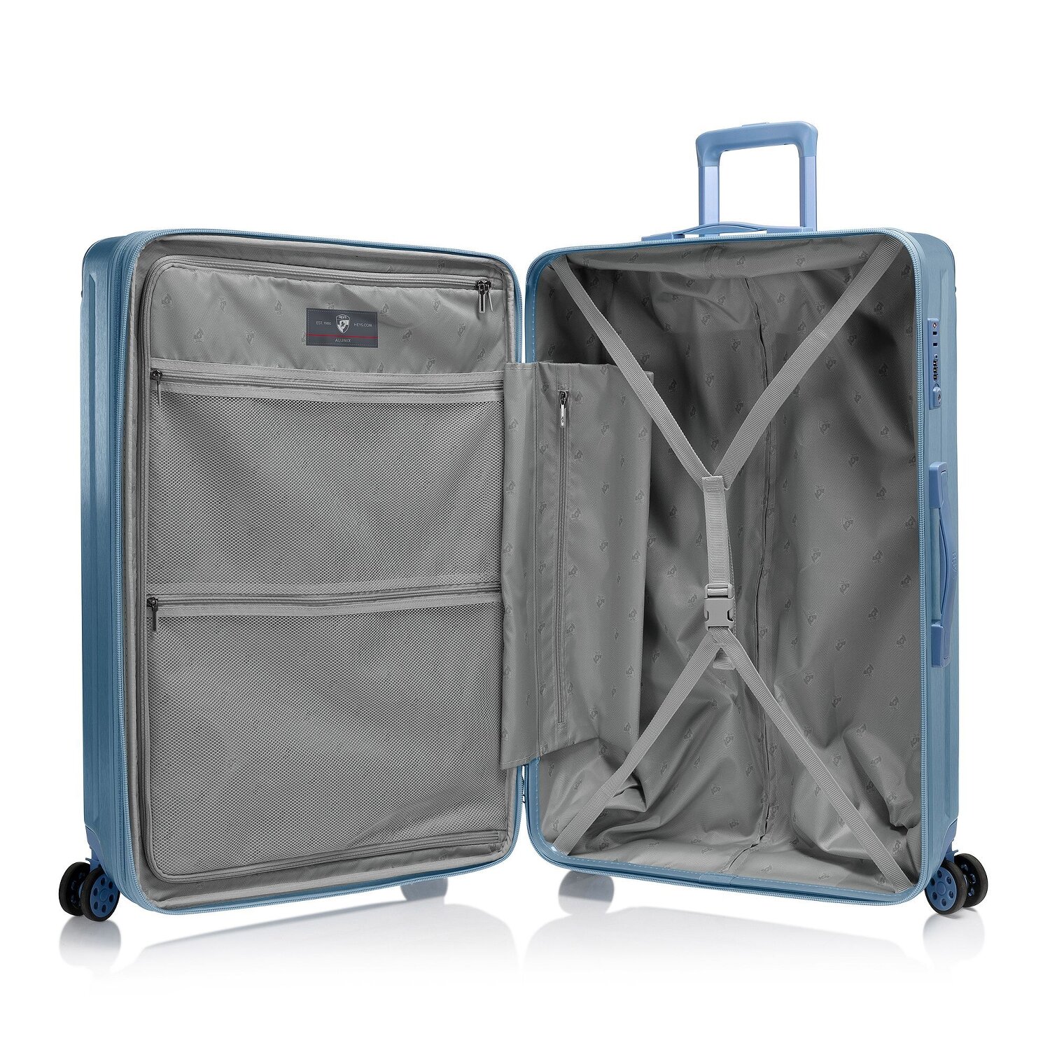 A life in the fast lane requires a companion that is up to any challenge: the Heys Alumix hard case. Made from robust polycarbonate, it offers plenty of extra space for souvenirs and vacation memories thanks to its expandable fold and clever cross-packing strap. The lockable handle conceals a practical TSA lock that prevents unauthorized access. The suitcase also has a useful mesh pocket and a zippered compartment. Make your travel life easier with the ergonomically shaped carrying handle. Let's go! With the Heys Alumix hard case, every trip becomes an unforgettable experience! Thanks to the expansion pleat, the case can be extended to a width of 35 cm.