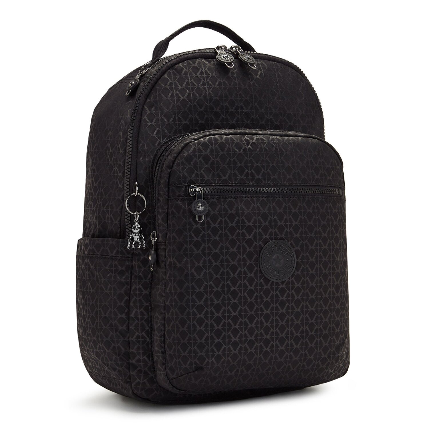 Charming backpack Kipling brand made of water-repellent materials with laptop compartment. In the spacious main compartment and the large zippered compartment on the front you can safely store items. The two side pockets provide additional storage space. The small monkey pendant is detachable. The perfect companion for everyday life or the next trip.