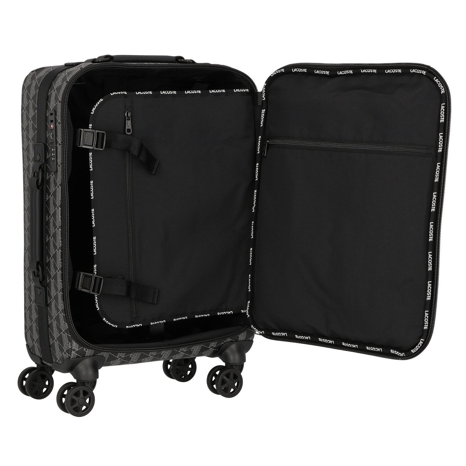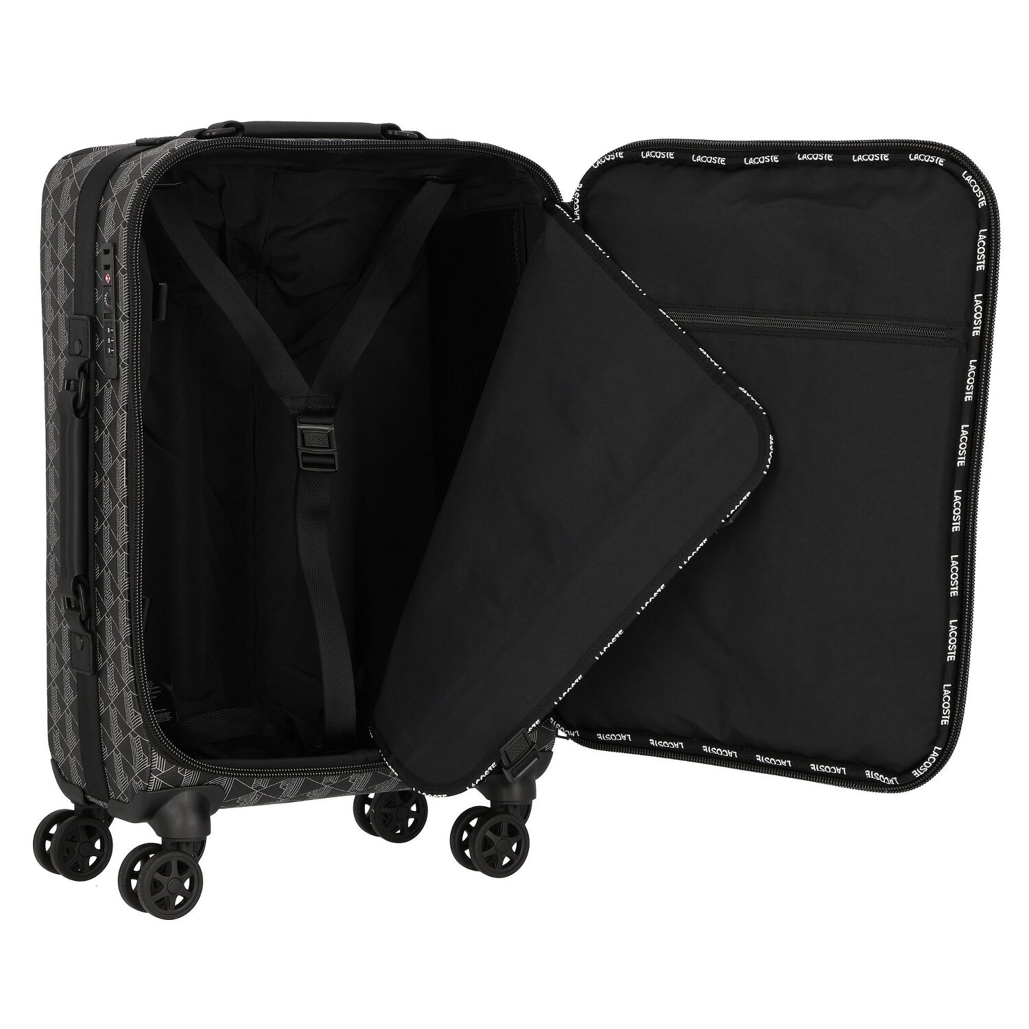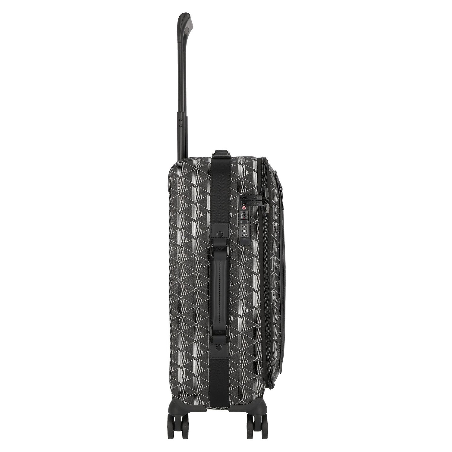 The Lacoste trolley from the grandiose "The Blend" series is the ultimate combination of style and functionality. Made from robust and durable PVC, the soft 4-wheel trolley offers optimum storage space and all the amenities you need when traveling. With its lockable handle and carry handle, it meets all the requirements of modern luggage. Inside, there are practical features such as a cross-body strap, divider/packing plate, zippered compartment and internal pockets. External pockets provide easily accessible storage space. The Lacoste TSA lock keeps your valuables safe. Make your travel experience unforgettable with this trolley!