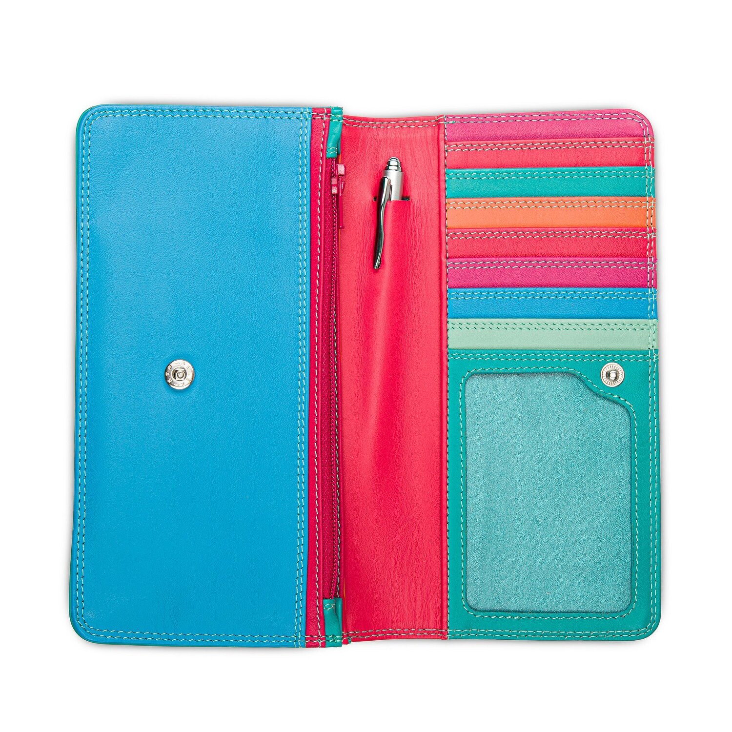 mywalit wallet in colorful, unique design. Many different color variations make the purse an eye-catcher. Closes with push button. With enclosed pen. Zipper compartment on the back.