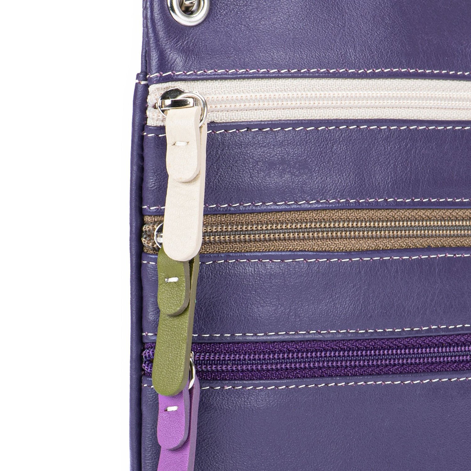 Chic leather chest bag in a colorful, unique design. Many different color variations make this shoulder bag an eye-catcher. The chest bag has three zippered compartments on the outside and an open outer compartment on the back. The ideal fashionable companion when traveling.