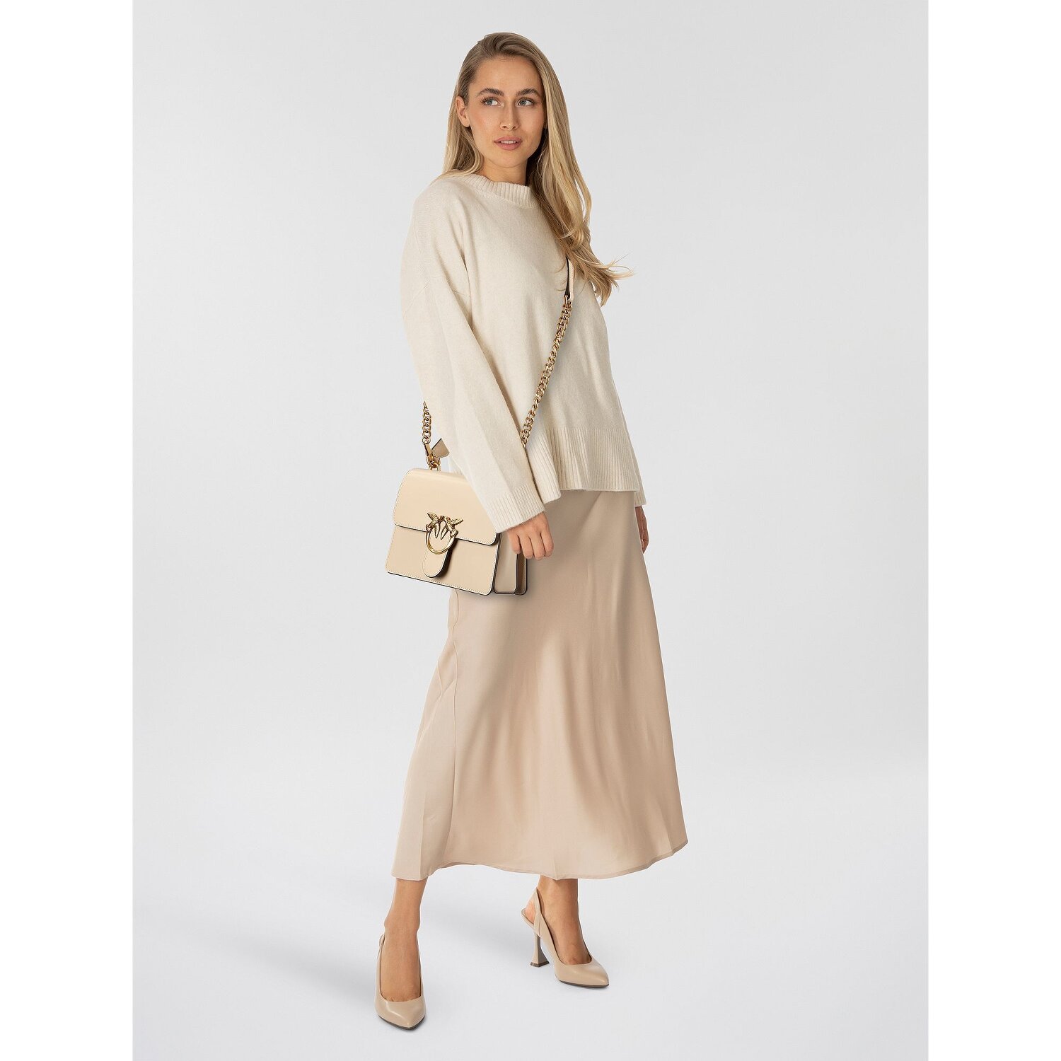 Stylish handbag from PINKO made of sturdy leather. The golden elements provide a noble, modern style. Here you will find enough space for your valuables. The perfect bag for a festive evening.