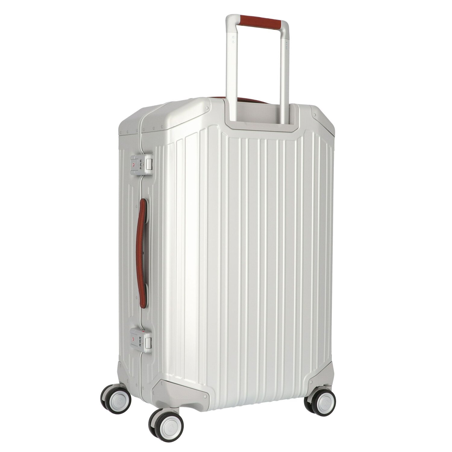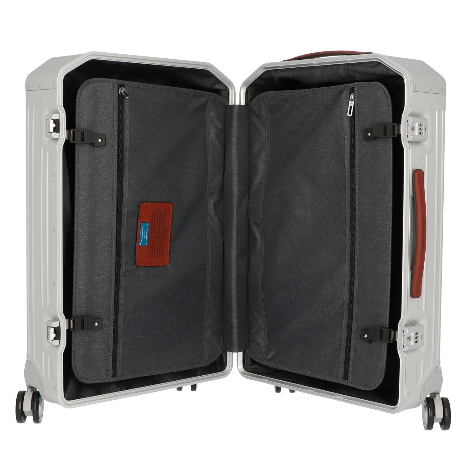 High-quality, elegant 4-wheel trolley from Piquadro of the Alu series made of durable, lightweight aluminum. The leather trim gives the trolley a special, luxurious look. It can be packed on both sides and offers plenty of storage space with several compartments. Four quiet and in all directions movable double wheels, a lockable handle and an integrated TSA lock for additional security round off the trolley stylishly.