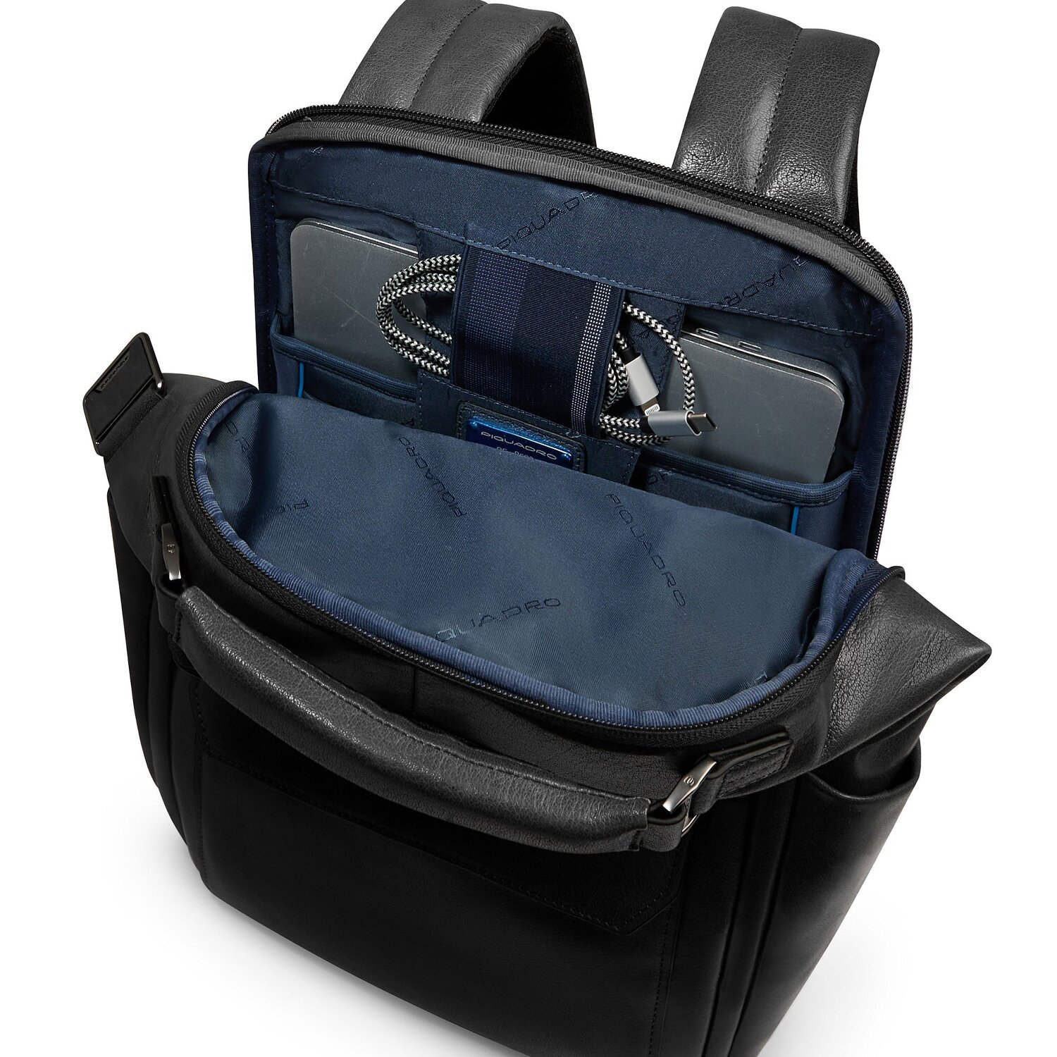 The Piquadro Solm Daypacks laptop compartment backpack is more than just a trendy accessory! Its unisex design in robust leather offers a versatile mix of style and practicality. It has comfortable back padding and can even be attached to a trolley. Equipped with a practical zippered compartment, available on the outside and inside, this bag ensures that everything is safe. Practical extras such as a glasses loop, a water bottle compartment and a carrying handle give it the decisive factor. Whether it's A4 documents, the cable pouch or the integrated laptop compartment with a screen diagonal of 36 cm, this backpack will surprise you with its unexpected perfections. And yes, there is also a tablet compartment! So what are you waiting for? Get your Piquadro Solm Daypacks laptop compartment backpack right now!