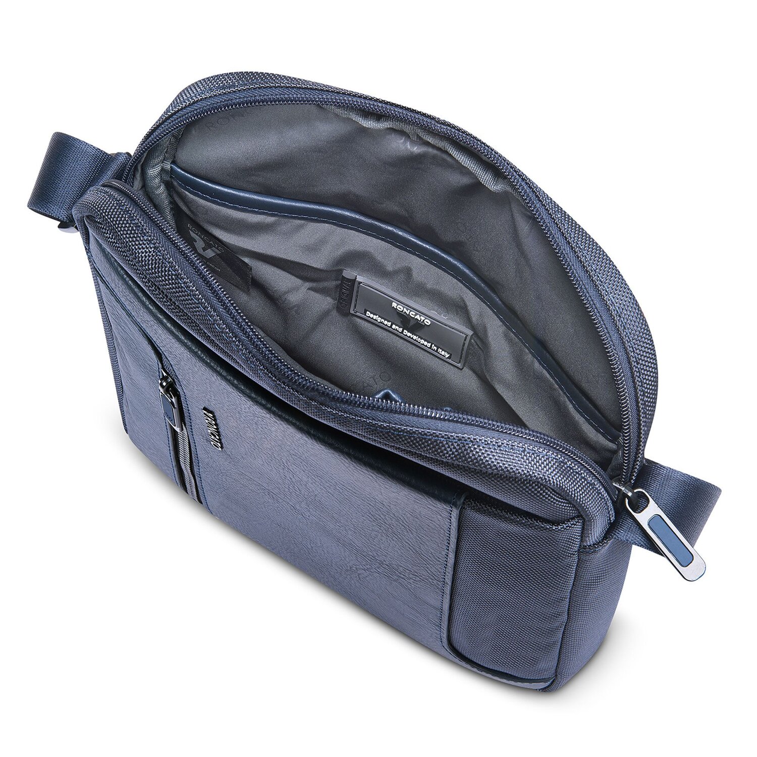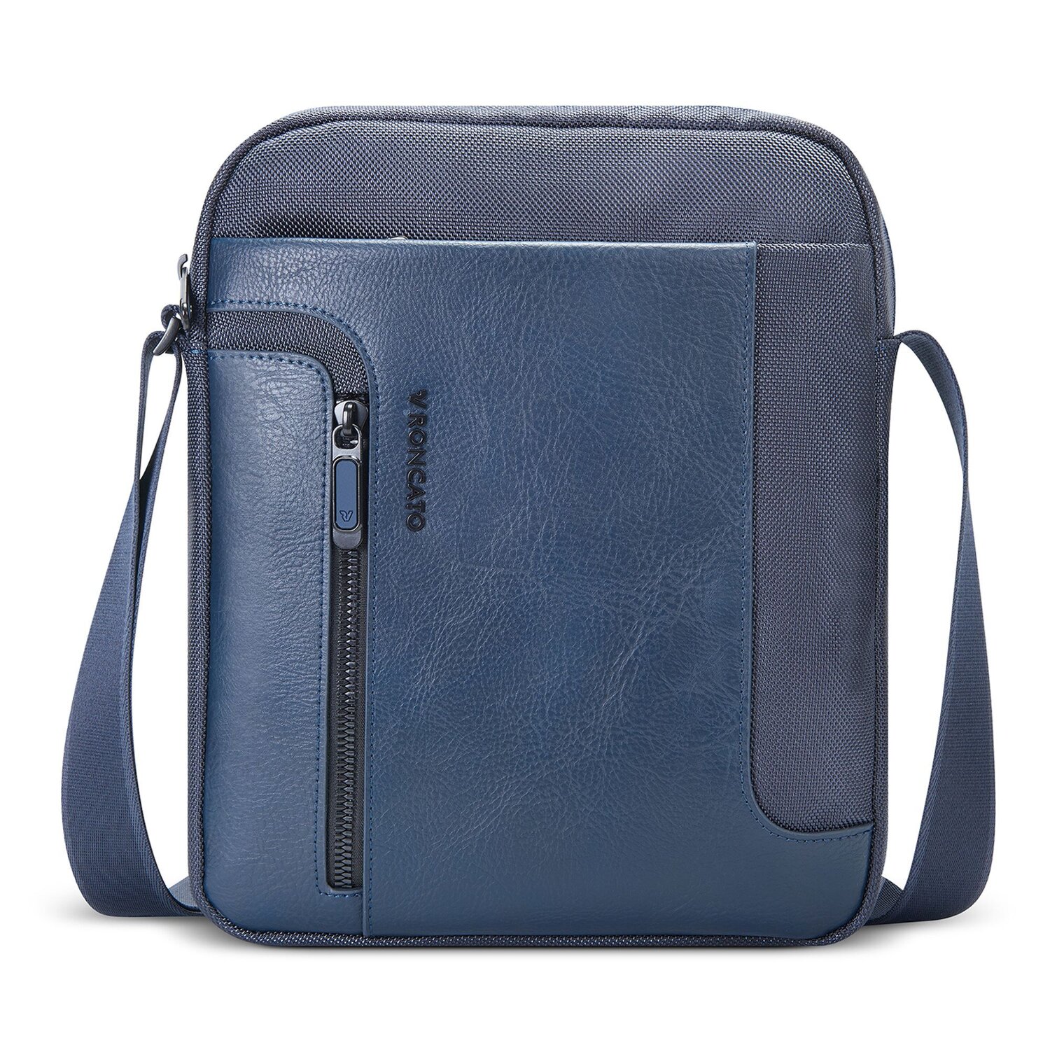 Fashionably simple men's shoulder bag from Roncato made of high quality nylon. The bag has a spacious main compartment, two pockets inside and a zippered compartment on the front. The ideal companion for many occasions.
