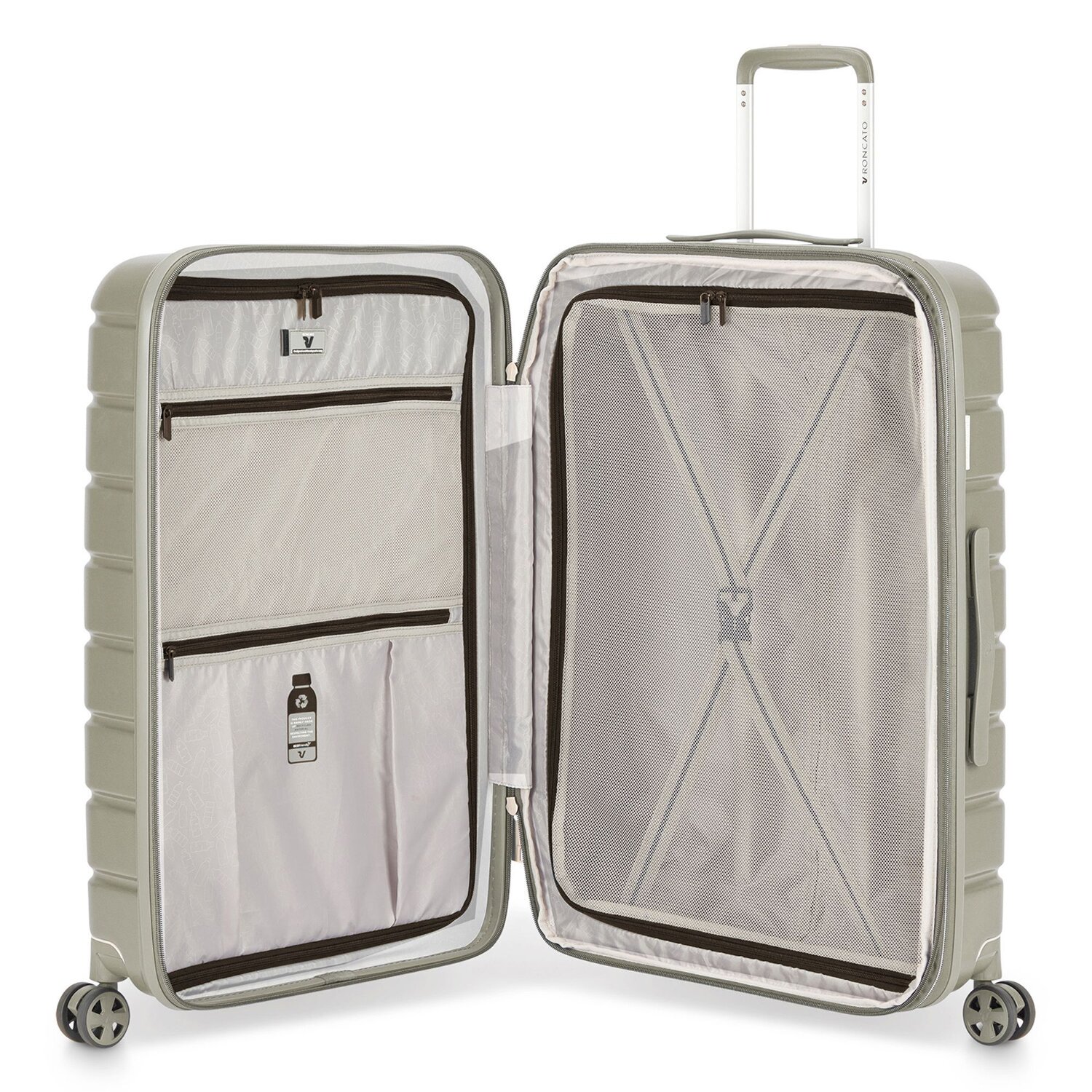 Ready to travel in style? RF presents the hard 4-wheel trolley from the "Relife" series by Roncato, designed for an optimal travel experience. With distinctive features such as an expandable gusset for extra luggage (+5 cm width), a practical and lockable handle, an efficient cross-body strap and various pockets, including a mesh pocket and zippered compartment, this trolley aims to maximize organization and convenience when travelling. Made from PET, the case features special extras such as an address tag, an elegant divider and a sturdy carry handle. The TSA lock, which impresses with its consistent security, is particularly noteworthy. Last but not least, the longevity, durability and easy-care properties of the PET material speak for themselves. Make your next trip a pleasure with this exceptional trolley.
