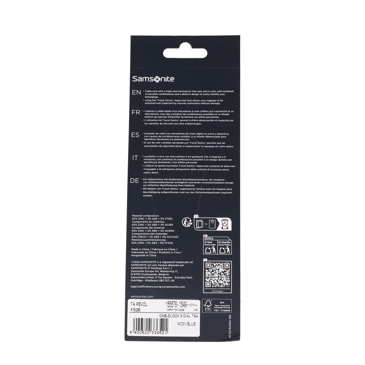 Travel safely in style: The TSA combination lock from Samsonite made of robust zinc alloy reliably protects your luggage. With a flexible cable lock, individually adjustable numerical code and elegant Samsonite logo, you are perfectly secured worldwide - conveniently and elegantly.