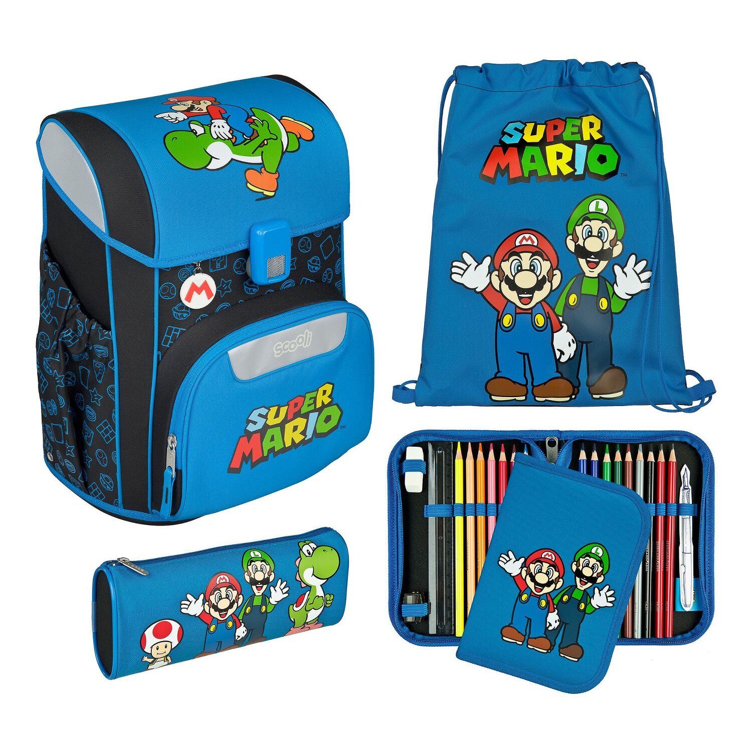 Ready for an adventure? With the 5-piece Scooli satchel set from the EasyStart series, you'll be perfectly equipped! The set has been specially developed for pupils in grades 1 to 4. Your books, exercise books and artwork fit perfectly in the special compartments for A4 documents. The backpack also has outer pockets for snacks and inner compartments for pens. A snap fastener ensures that everything is securely stowed away but remains easily accessible. And for safety on the way to school, there are stylish reflectors on the backpack. You'll be the eye-catcher in the school playground! Get this cool set now and get off to a flying start! Dimensions: 36 cm x 23 cm x 37 cm - 0.98 kg - 19 L included in the set: The EasyStart satchel, a gym bag, a pouch, a pencil roll and a tag.