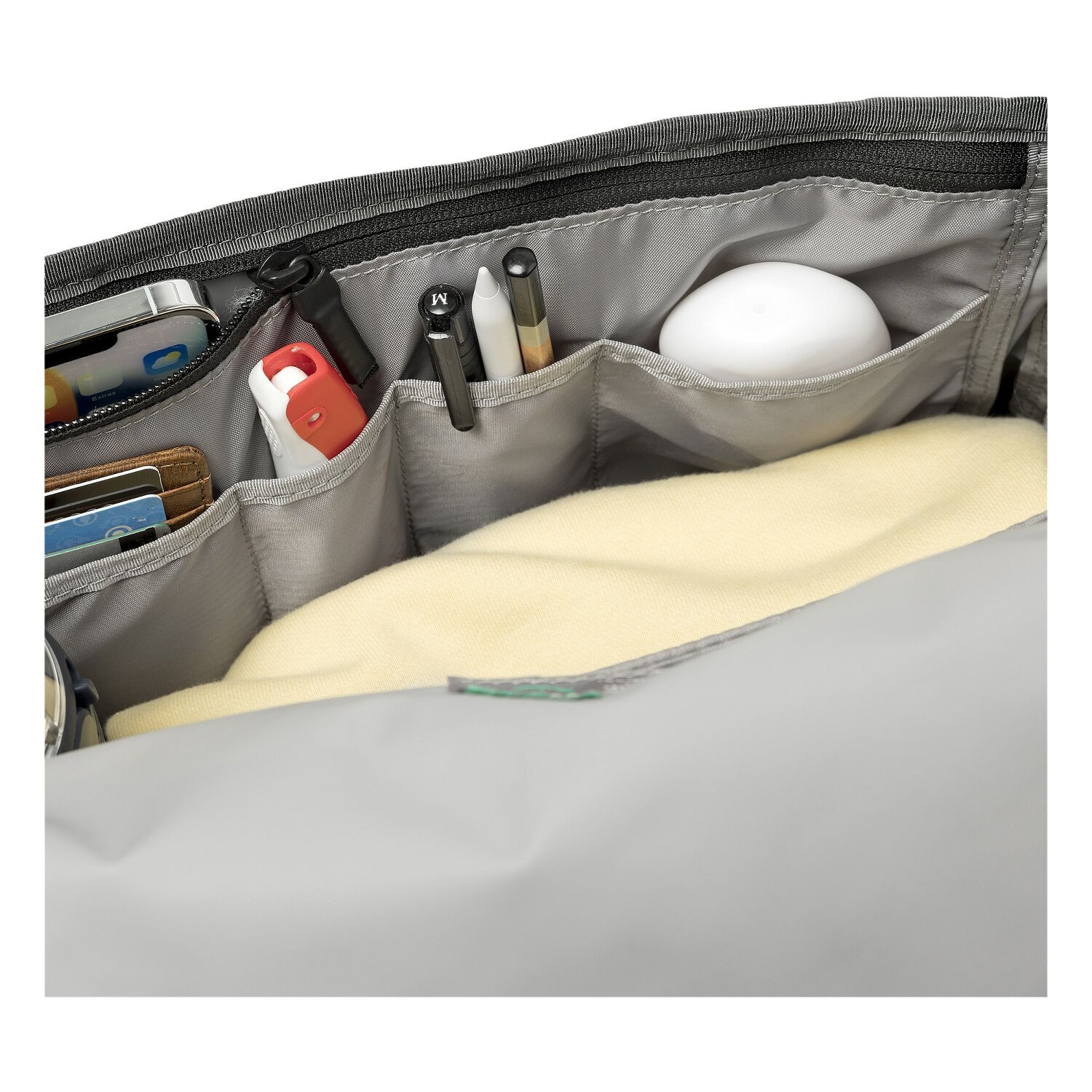- Features: Zipper compartment, Mobile phone holder, Inside pocket(s), Exterior pocket(s)