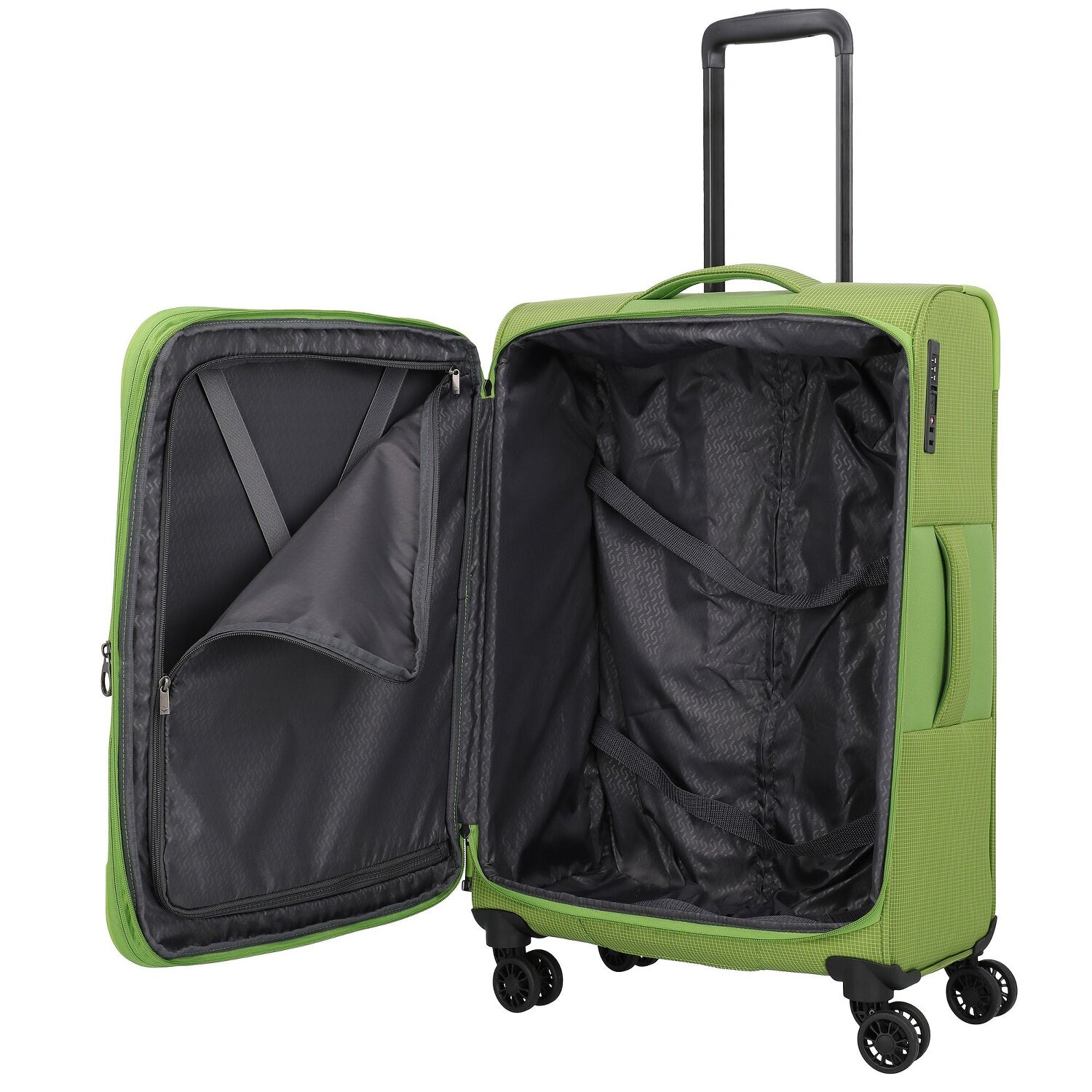 Set new standards when traveling with the 4-piece travel set from Travelite's Corsiica series. A combination of robustness and style, this supple soft luggage on 4 wheels is made of durable polyester. Elaborately crafted with functional extras such as a laundry compartment and a practical outer pocket. The lockable handle simplifies handling, while packing straps on the inside keep everything securely in place. A reliable companion, protected by a TSA lock. Start your next travel adventure now with this indispensable helper.