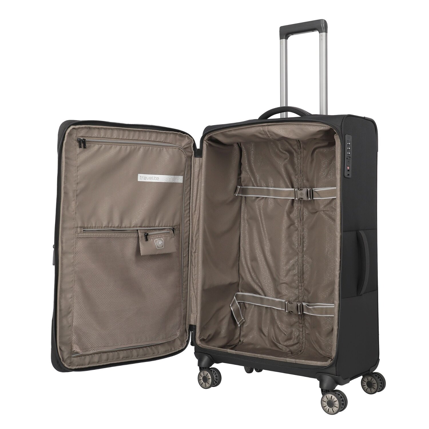 - Features: Zipper compartment, Mesh compartment, Lockable handle, Inside pocket(s), Inner packing straps, Exterior pocket(s), Expandable