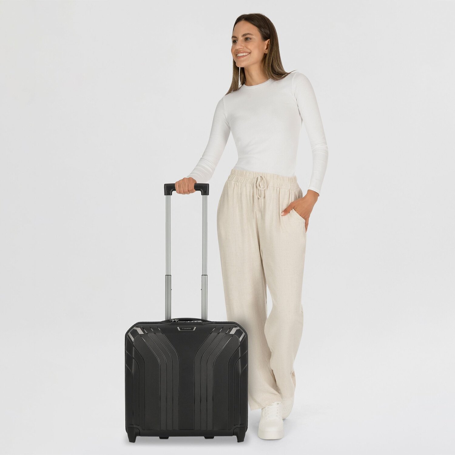 Stylish business trolley with 2 large wheels from Travelite, which is characterized by an excellent interior layout. There is a padded laptop compartment for devices with a screen diagonal of up to approx. 40 cm (15.6 inches) as well as a removable clothes pocket. A zippered compartment on the inside provides additional storage space, and the case can also be attached to larger trolleys thanks to a strap on the back. Your new traveling companion.