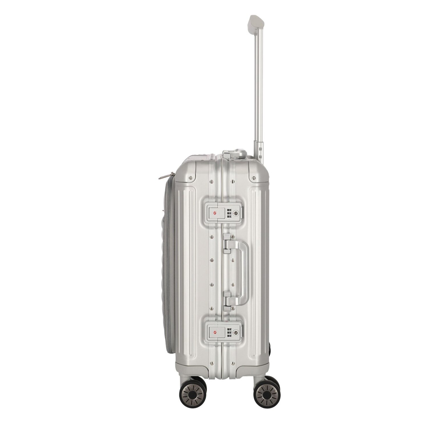 This cabin trolley made of robust aluminum is elegant, sturdy and of high quality. It impresses with its classic design concept with a horizontal groove structure. With a TSA lock for increased security, four quiet double wheels that can be moved in all directions and a well thought-out interior layout, the trolley is a functional and stylish companion for every trip.