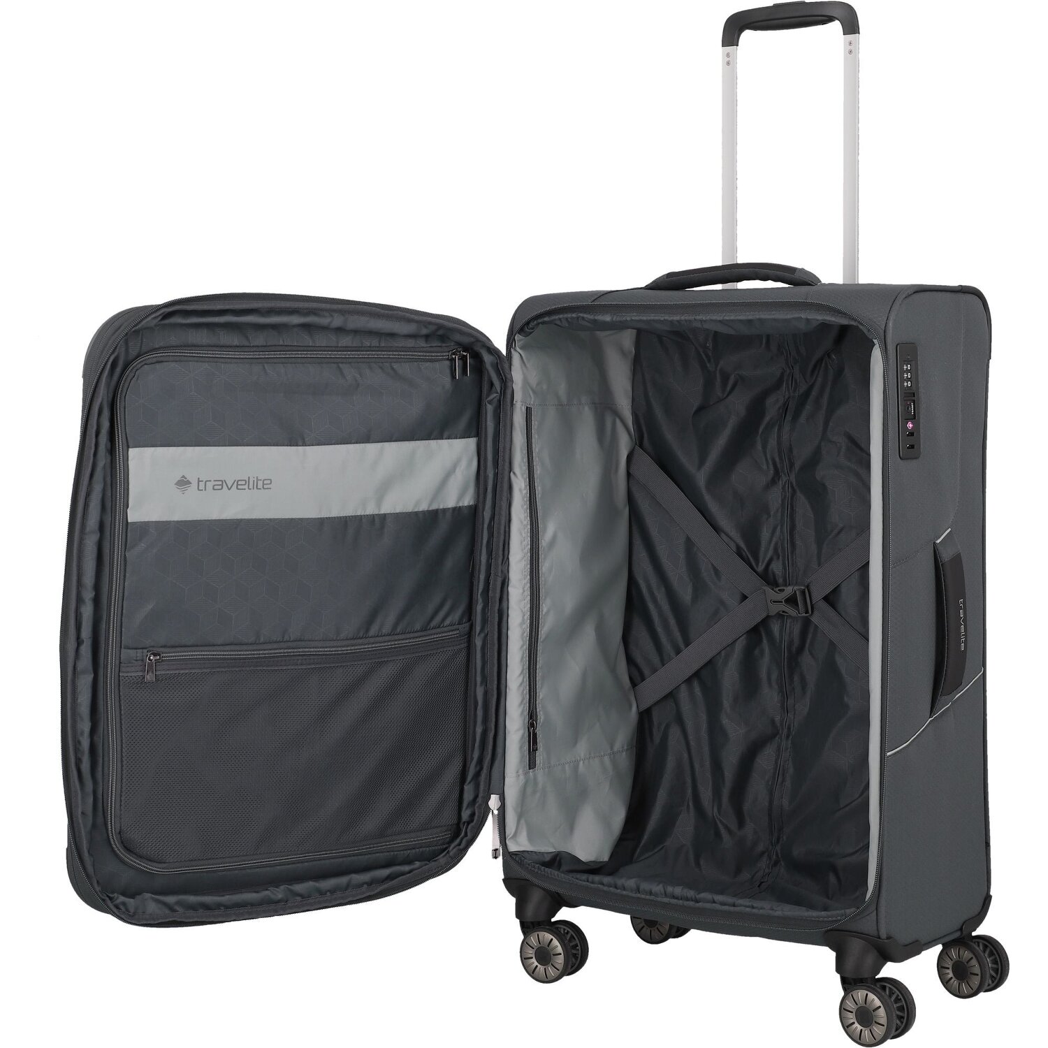 - Features: Zipper compartment, Lockable handle, Inside pocket(s), Inner packing straps, Exterior pocket(s), Expandable