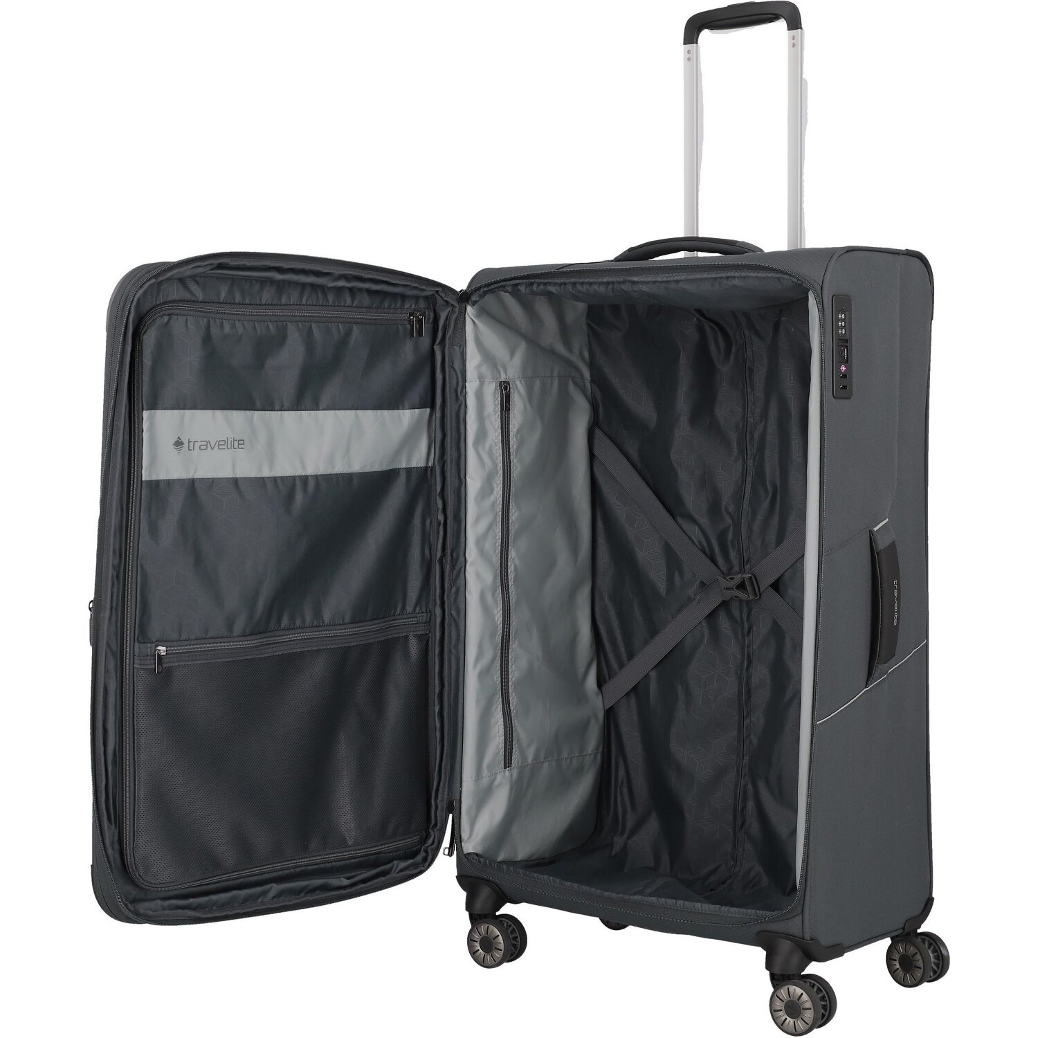 - Features: Zipper compartment, Lockable handle, Inside pocket(s), Inner packing straps, Exterior pocket(s), Expandable
