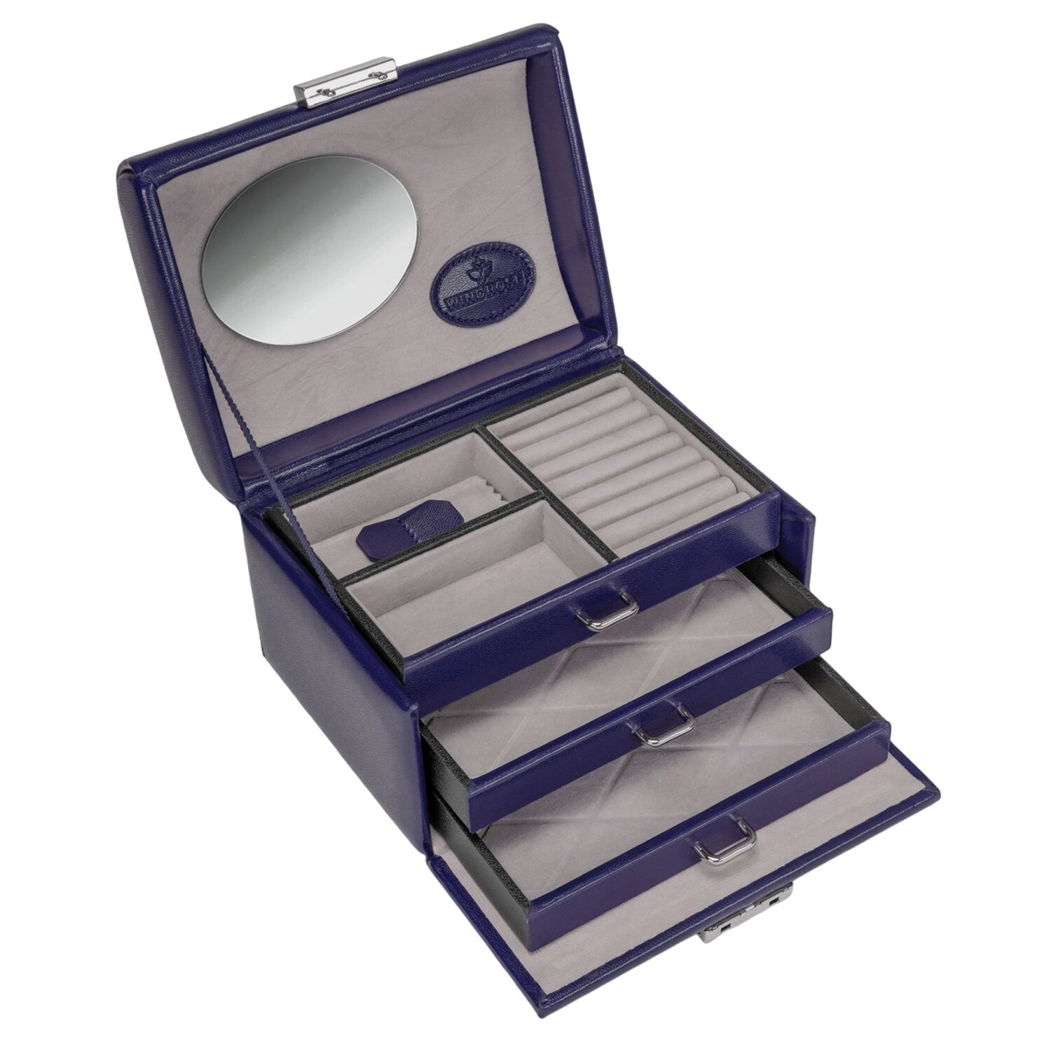 The elegant jewelry box from Windrose offers a variety of compartments for every type of jewelry, an integrated mirror and two practical drawers for an optimal overview. The stylish front with the Windrose logo adds a special touch, while the secure plug fastener reliably protects your favorite pieces. A charming highlight for every jewelry lover.