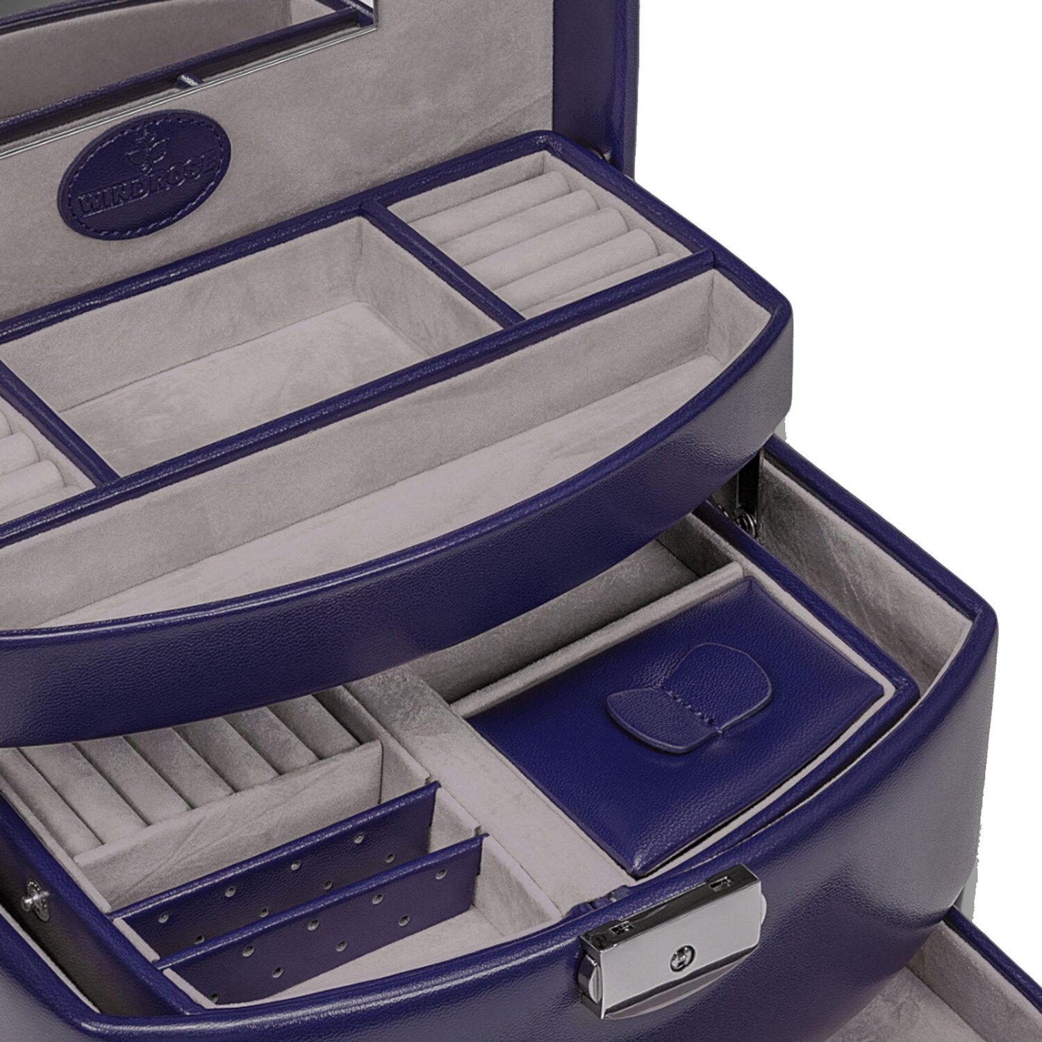 From Windrose comes this marvel of craftsmanship, with plenty of storage space and even specialized storage such as slots for rings or earrings. The built-in mechanism divides the jewelry box into 3 different levels when opened. The middle level is designed so that the compartments can still be used when the box is folded.