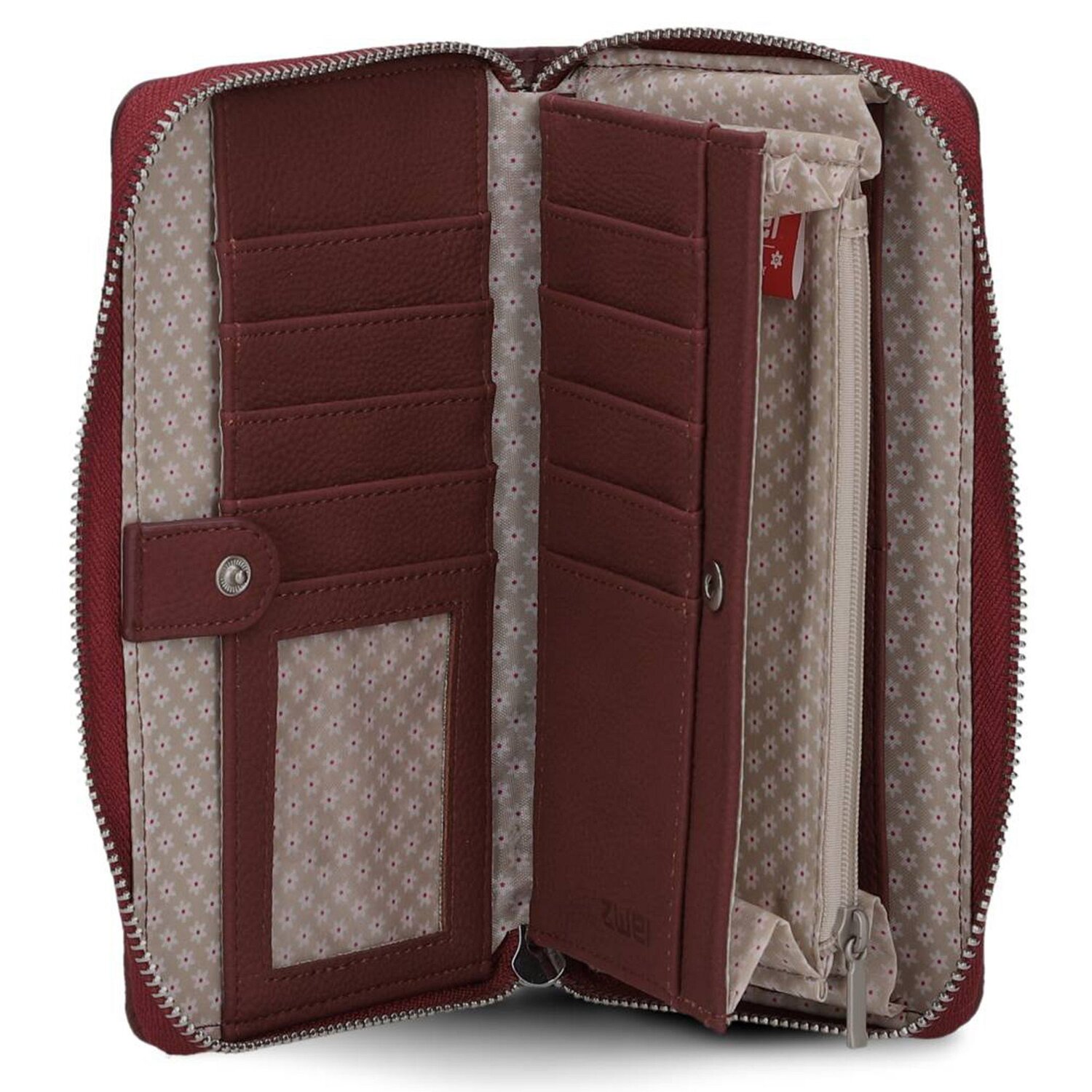 Perfectly shaped elegance meets sophisticated functionality in the Zwei Eva ladies' wallet. It impresses with its clear lines and is an indispensable companion in any handbag. With 15 credit card slots, a coin compartment, two bill compartments and a compartment for your ID, it is the perfect organizer for all your valuables. The sturdy zipper secures the contents and the durable polyurethane material withstands the turmoil of everyday life. The glossy finish pays homage to modern design and makes this wallet a stylish statement. Expand your accessory repertoire with this practical favorite.