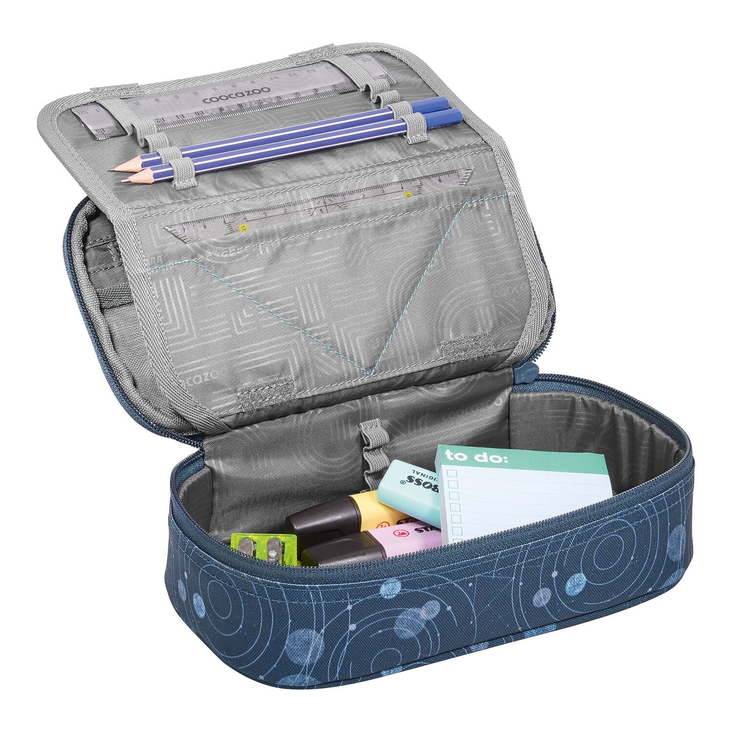 It's a fun way to start lessons: the coocazoo pencil case will be your constant companion! A special highlight are the various pen pockets, where every writing utensil finds its place. Equipped with a zippered compartment, mesh pocket and a useful equipment loop, the pencil case is a real all-rounder. The robust zipper opens and closes easily - perfect for quickly accessing your pens. The hard-wearing polyester makes it durable and resistant. Not only the perfect organizer, but also a cool accessory for every little school master! Only the ruler and a set square are included. Pictures may differ from the scope of delivery.
