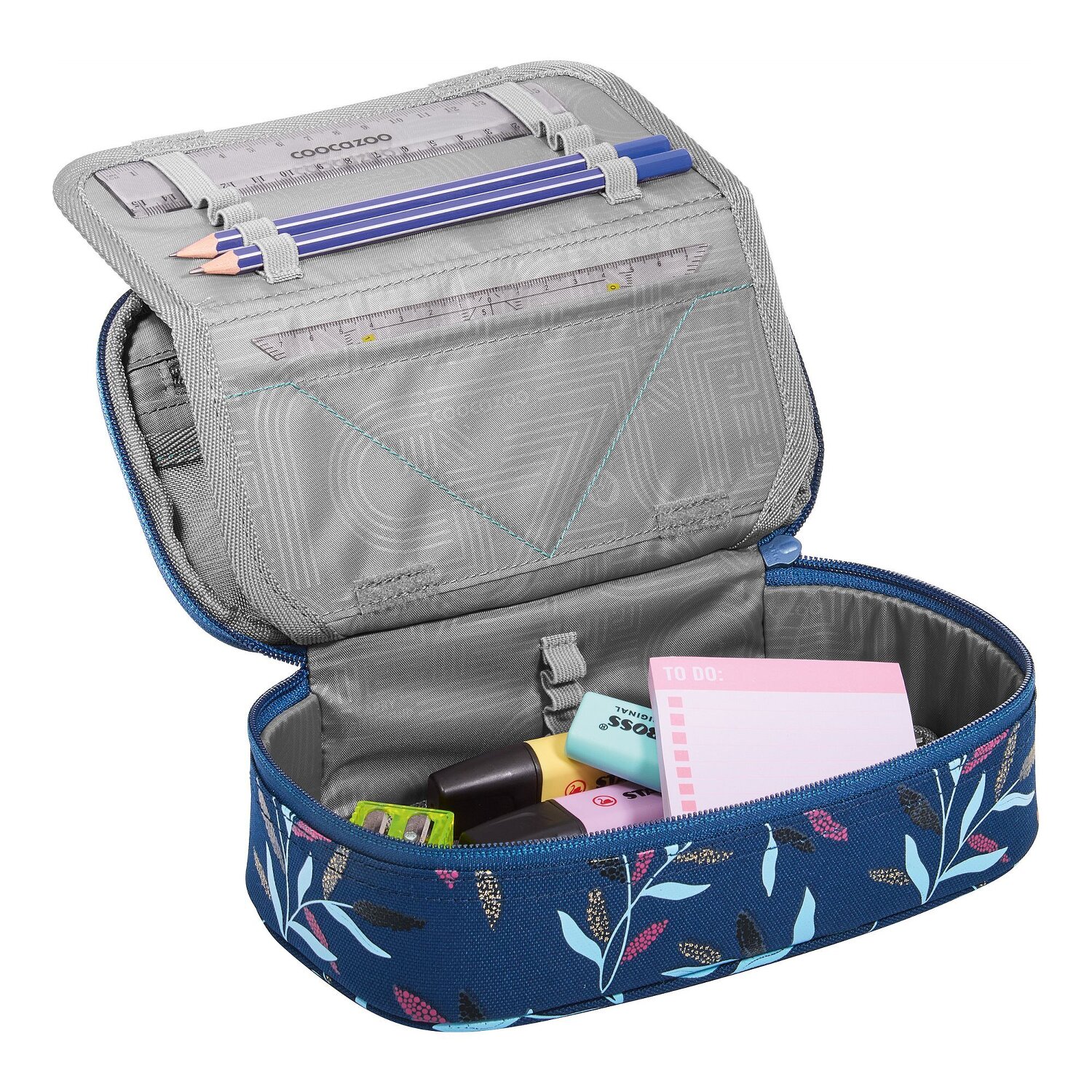 It's a fun way to start lessons: the coocazoo pencil case will be your constant companion! A special highlight are the various pen pockets, where every writing utensil finds its place. Equipped with a zippered compartment, mesh pocket and a useful equipment loop, the pencil case is a real all-rounder. The robust zipper opens and closes easily - perfect for quickly accessing your pens. The hard-wearing polyester makes it durable and resistant. Not only the perfect organizer, but also a cool accessory for every little school master! Only the ruler and a set square are included. Pictures may differ from the scope of delivery.