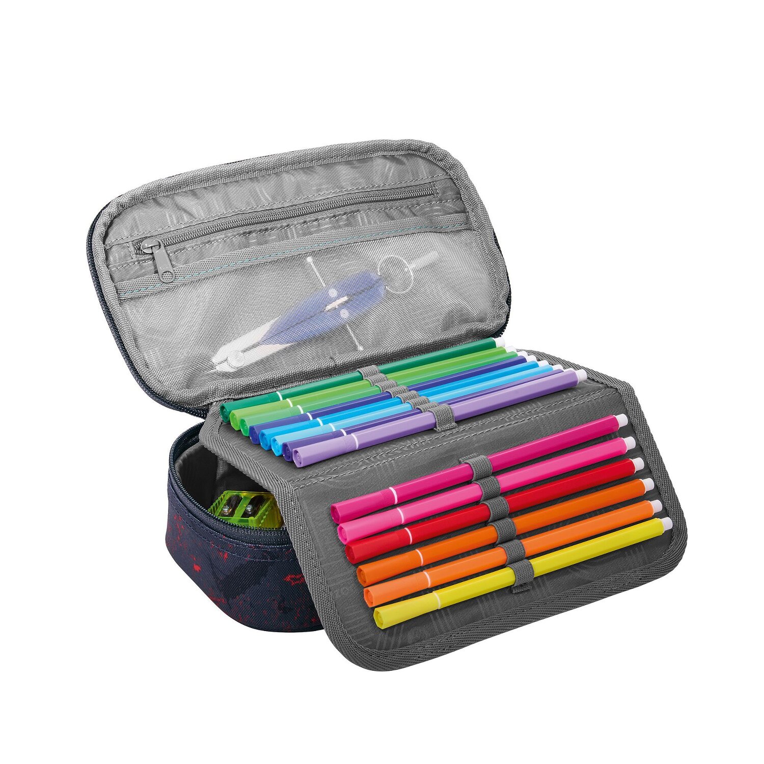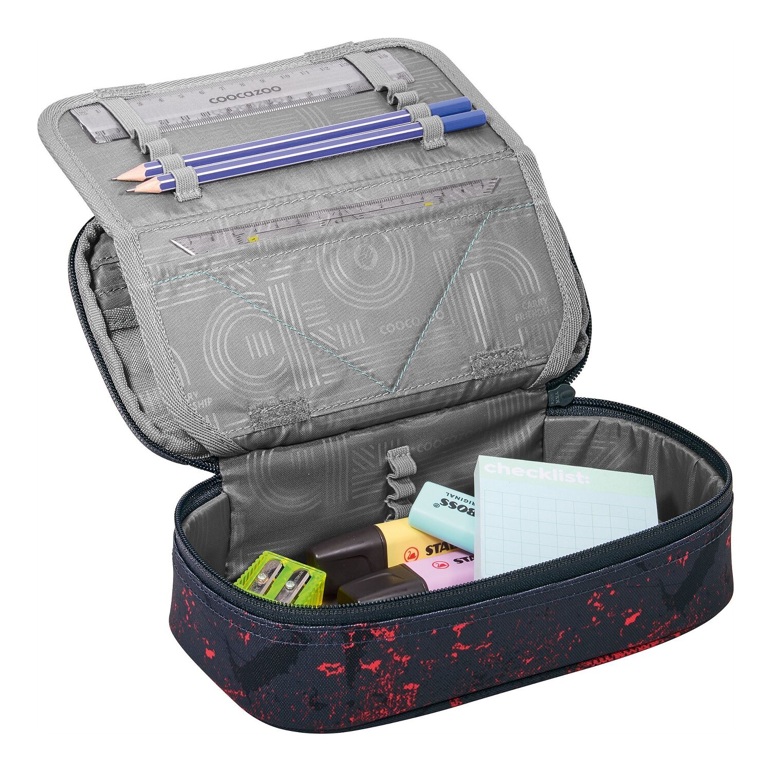 It's a fun way to start lessons: the coocazoo pencil case will be your constant companion! A special highlight are the various pen pockets, where every writing utensil finds its place. Equipped with a zippered compartment, mesh pocket and a useful equipment loop, the pencil case is a real all-rounder. The robust zipper opens and closes easily - perfect for quickly accessing your pens. The hard-wearing polyester makes it durable and resistant. Not only the perfect organizer, but also a cool accessory for every little school master! Only the ruler and a set square are included. Pictures may differ from the scope of delivery.