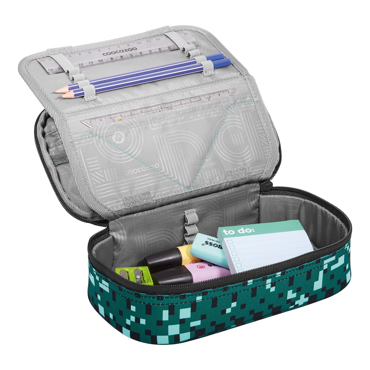 It's a fun way to start lessons: the coocazoo pencil case will be your constant companion! A special highlight are the various pen pockets, where every writing utensil finds its place. Equipped with a zippered compartment, mesh pocket and a useful equipment loop, the pencil case is a real all-rounder. The robust zipper opens and closes easily - perfect for quickly accessing your pens. The hard-wearing polyester makes it durable and resistant. Not only the perfect organizer, but also a cool accessory for every little school master! Only the ruler and a set square are included. Pictures may differ from the scope of delivery.