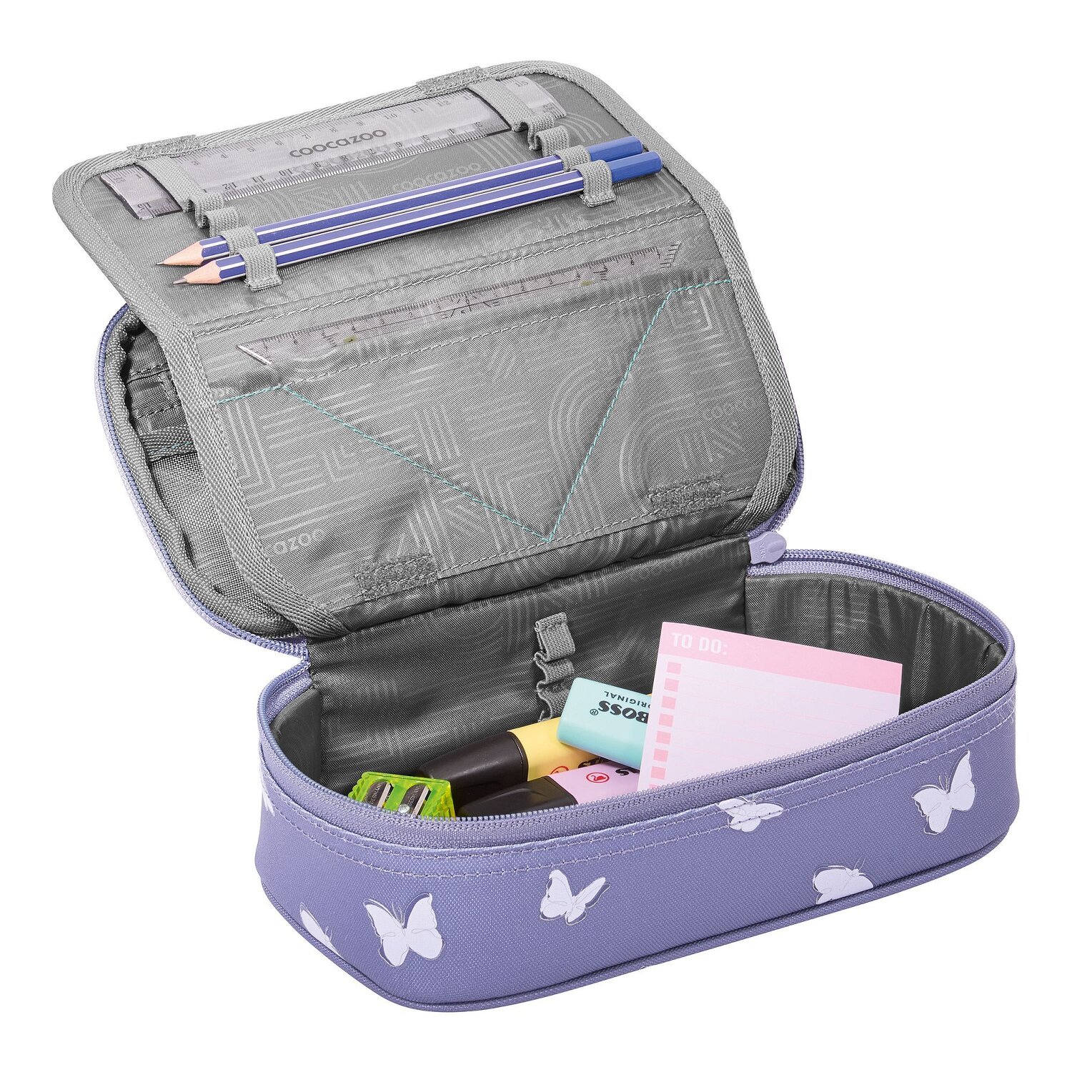 It's a fun way to start lessons: the coocazoo pencil case will be your constant companion! A special highlight are the various pen pockets, where every writing utensil finds its place. Equipped with a zippered compartment, mesh pocket and a useful equipment loop, the pencil case is a real all-rounder. The robust zipper opens and closes easily - perfect for quickly accessing your pens. The hard-wearing polyester makes it durable and resistant. Not only the perfect organizer, but also a cool accessory for every little school master! Only the ruler and a set square are included. Pictures may differ from the scope of delivery.