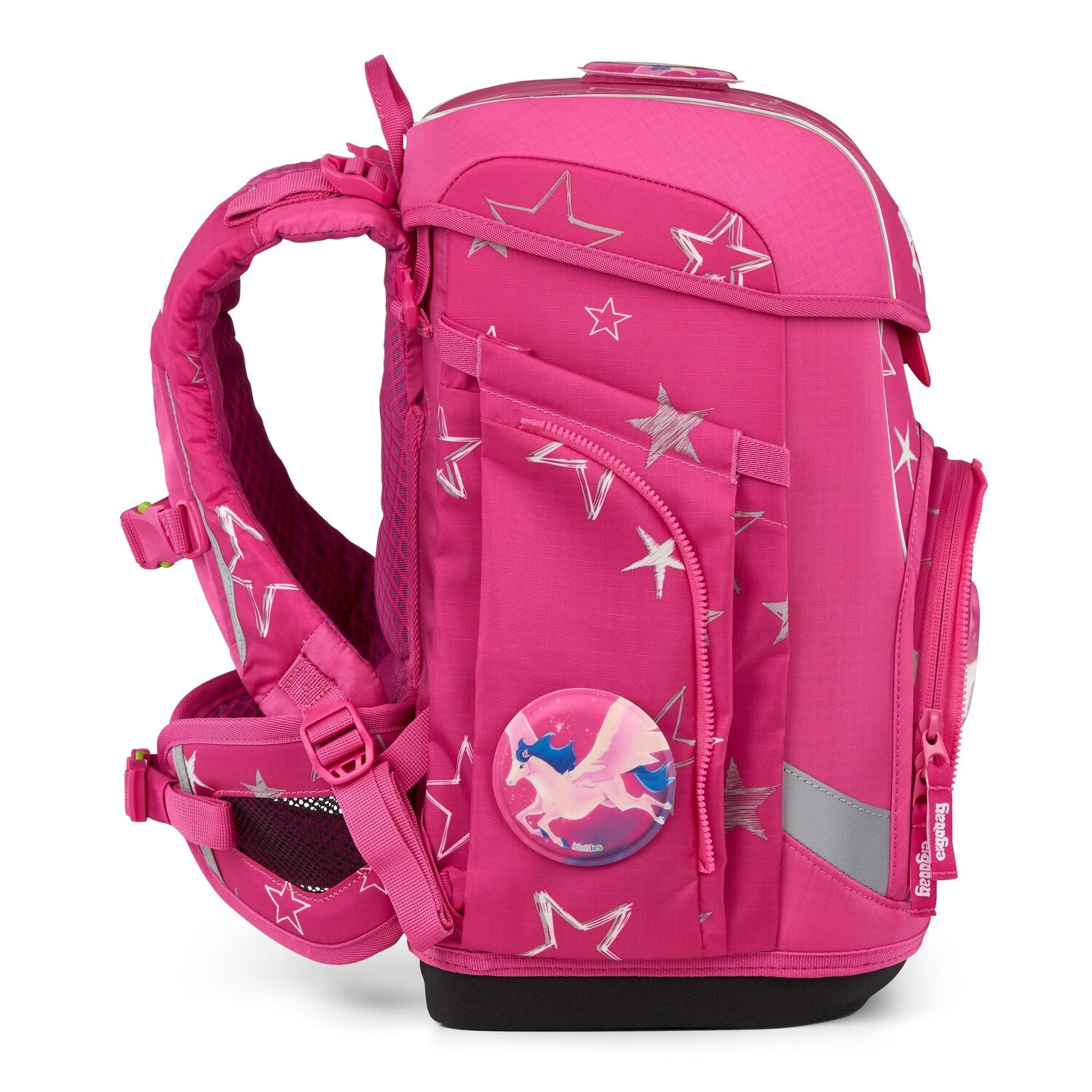 The Ergobag Cubo satchel is ideal for children from the 1st grade and convinces with ergonomics, individuality, sustainability and visibility. The Cubo Light combines the classic satchel shape with the proven Ergobag carrying system. Wide pelvic fins ensure optimum weight transfer to the stable pelvic area. The popular Kletties make it possible to customize the Cubo as desired. Made from recycled PET bottles, the satchel contributes to environmental friendliness. For additional safety on the road, a matching safety set can be purchased separately. The stable base and the comfortable carrying system with lap and chest straps support freedom of movement - even when romping around. The set contains: Satchel 2 Zippie side pockets Sports bag Pencil case 22-piece pencil case 4-piece Kletties set